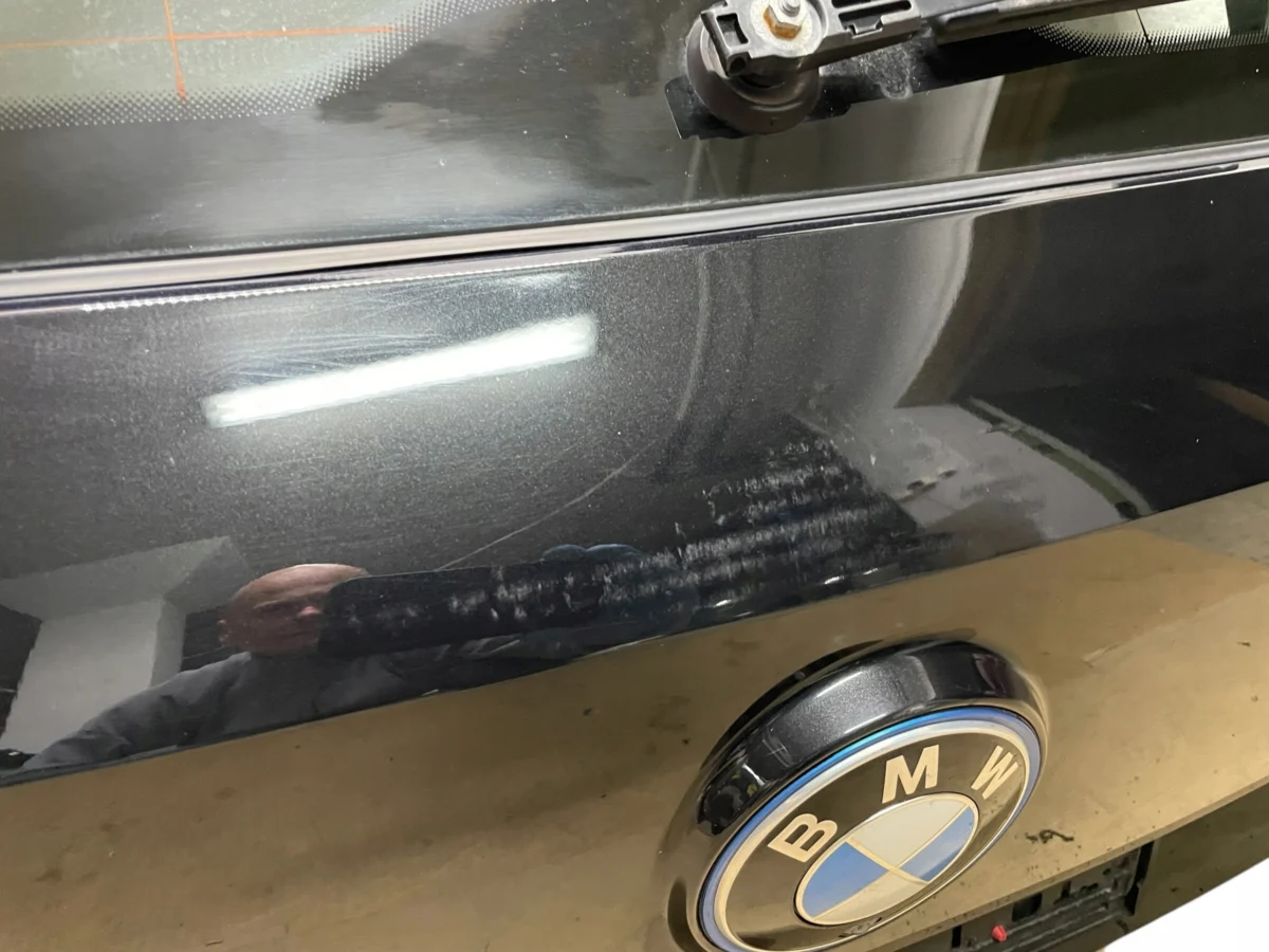 Stan bardzo dobry do zzłożenia w kolor – delikatny odprysk lakieru wielkości 2 mm, nad znaczkiem BMW delikatne obtarcie od kartonu do spolerowania.